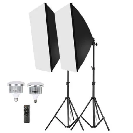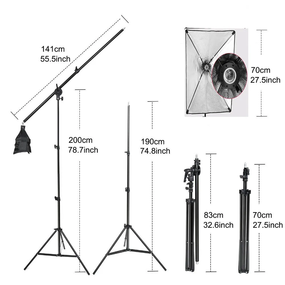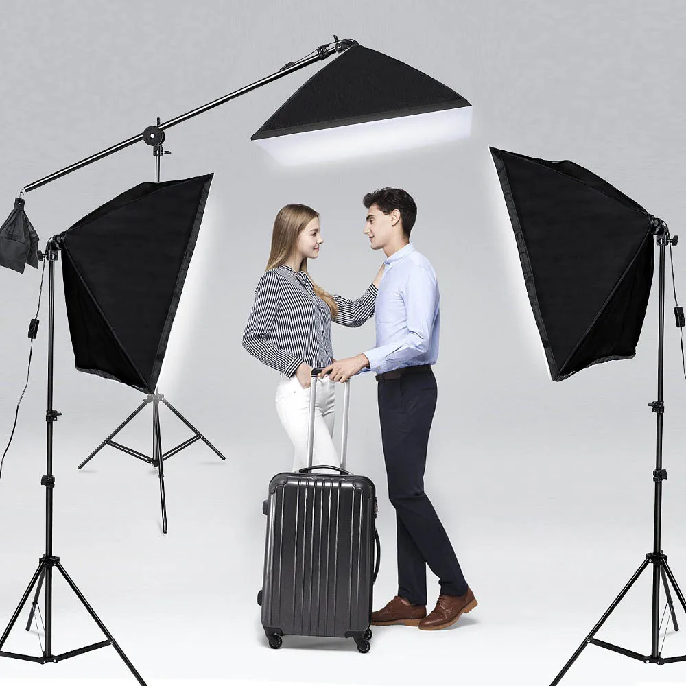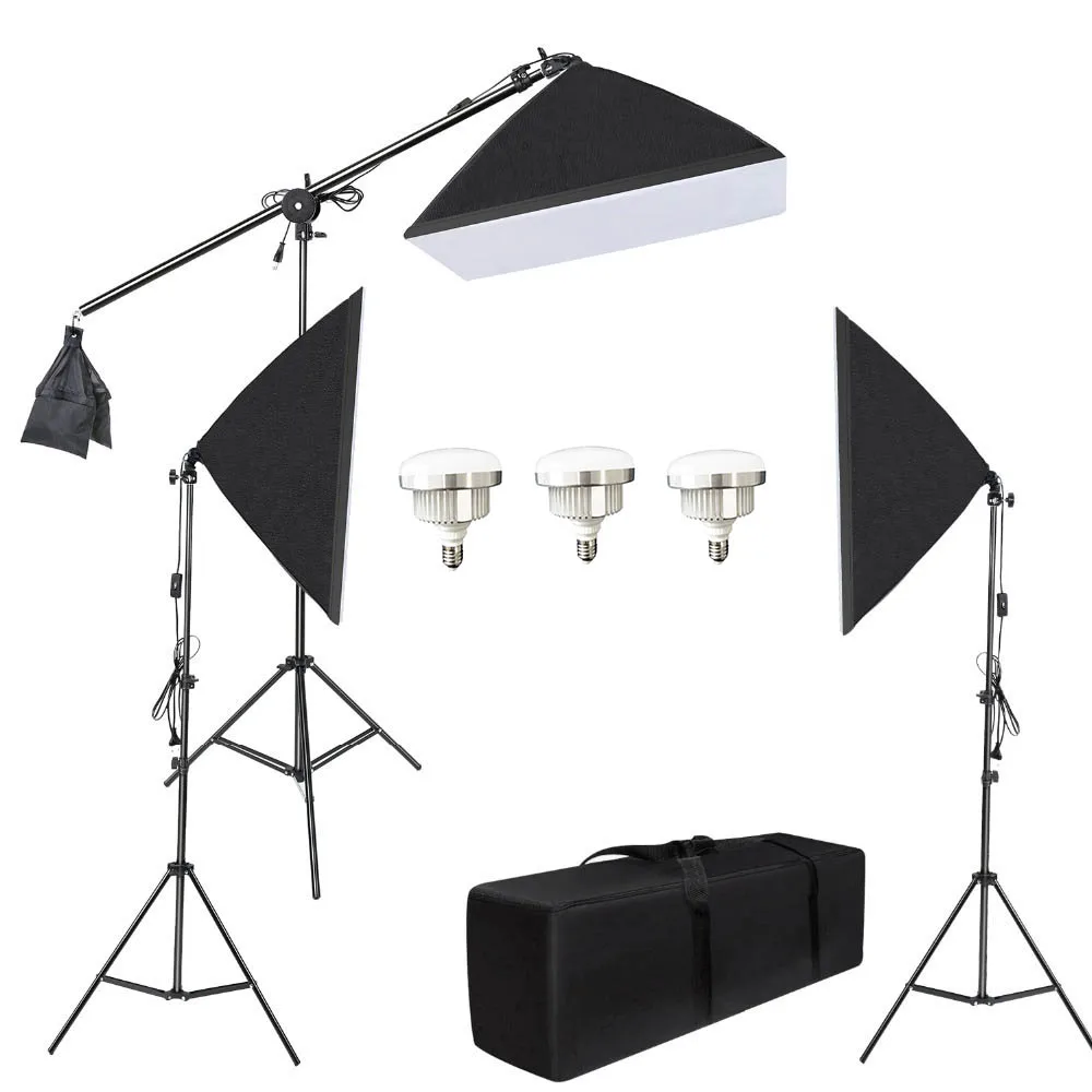 1. 3pcs constant light softbox lighting system which comes with 2 softboxes and 1 overhead hairlight boom softbox.