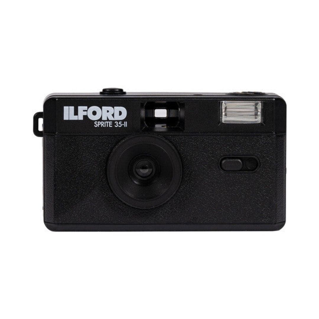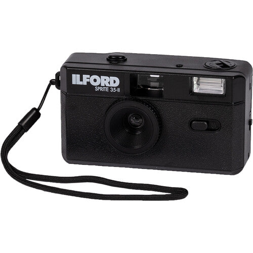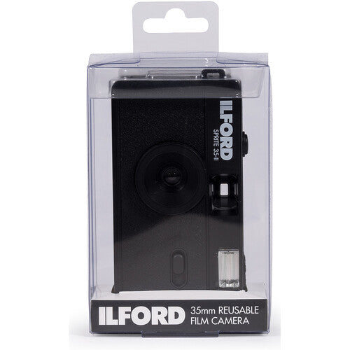Offered here in black, the Sprite 35-II Film Camera from Ilford is a basic and easy-to-use film camera for general use. The camera has a fixed-focus wide-angle lens, perfect for capturing most well-focused daylight scenes, and the camera also features a built-in flash with a 15 second recycle time for night time shooting. Compatible with 35mm color negative or black and white film, the Sprite-II allows you to capture quick snapshots or moody monochrome scenes. Designed for simple operation, the camera has a manual film advance winding lever to move through each exposure and rewind the roll when the film is finished.