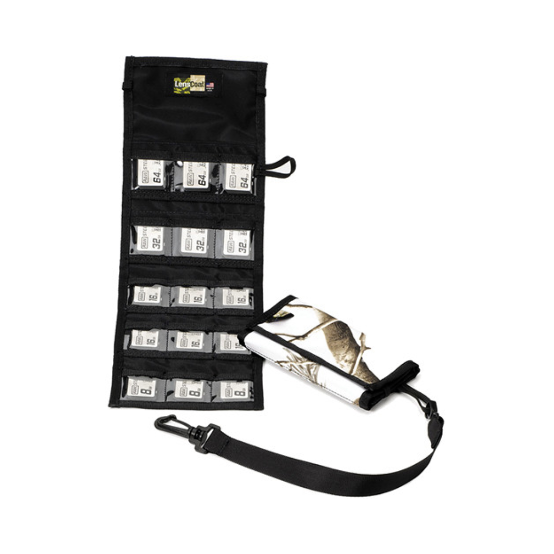The black Memory Card Wallet SD15 from LensCoat holds up to 15 SD cards. The material is a lightweight poly tricot/nylon. The wallet secures with a quiet elastic closure, and is carried by a clip-on tether. All the interior pockets have clear windows so you can easily see which card you need. In addition, a handy business card slot is provided for that quick networking moment. The Memory Card Wallet SD15 is made in the USA.