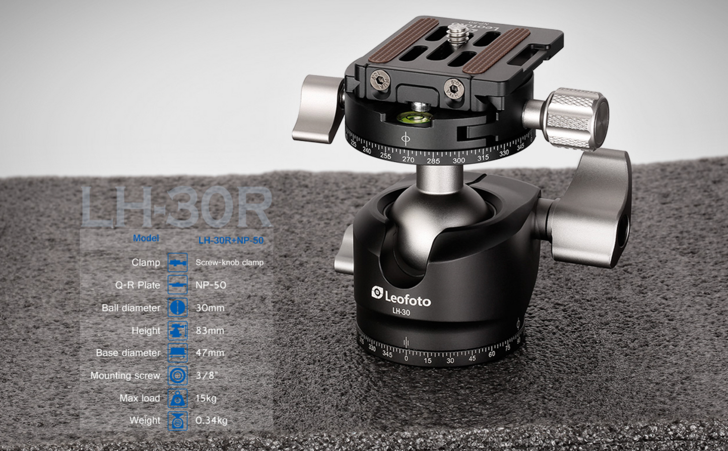 Leofoto LH-30R Low Profile Ball Head is a low profile ball head with independent pan lock knob. Weighing only 325g with a max load of 12kg, this tripod head is a great ball head for travel and general photography