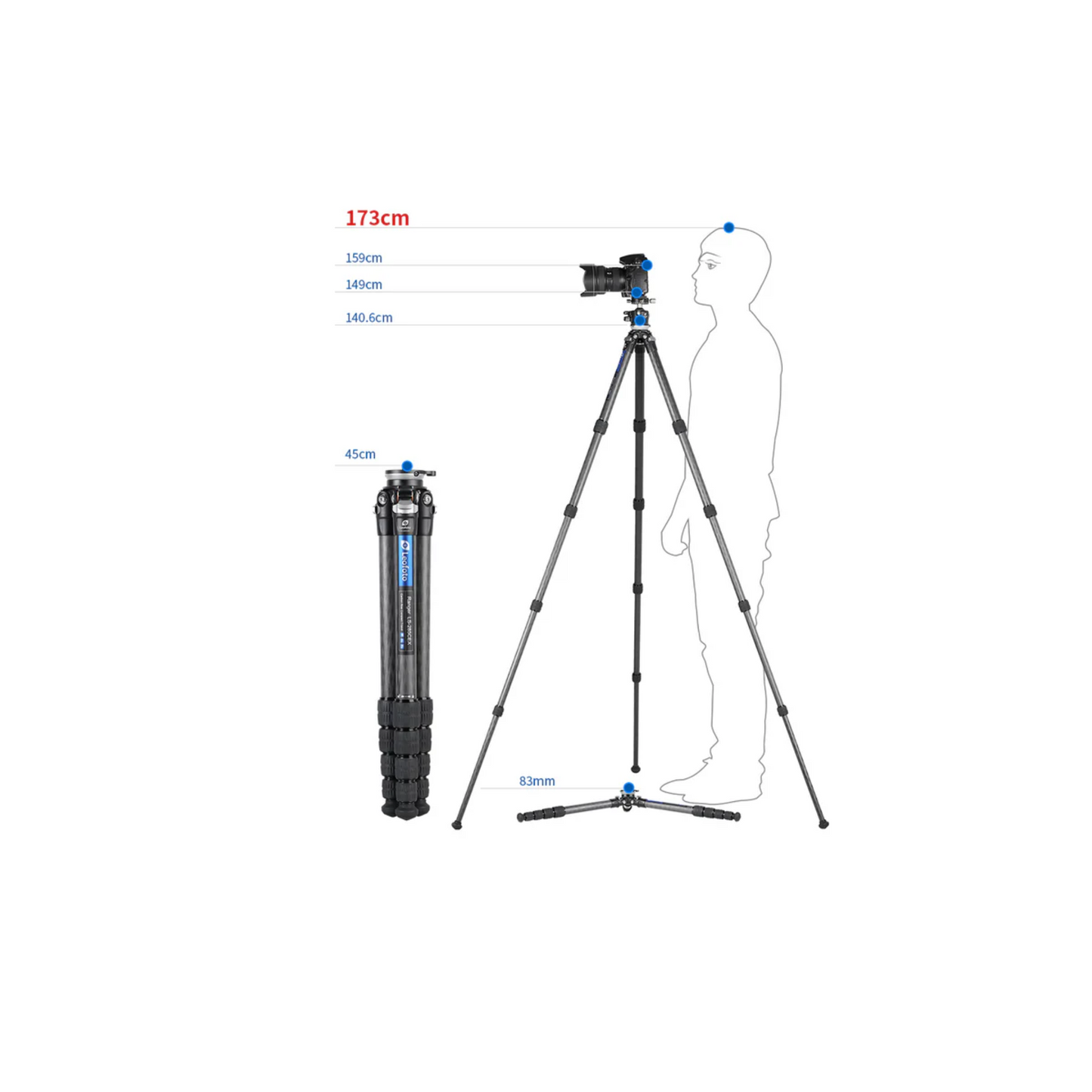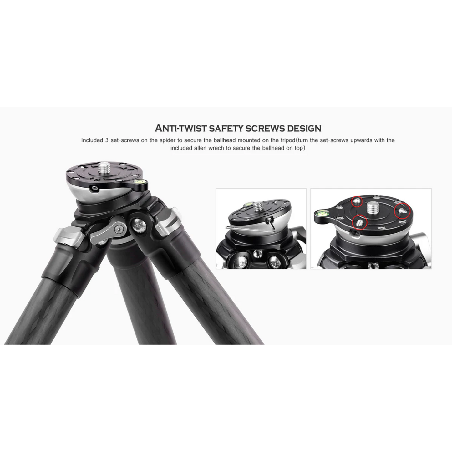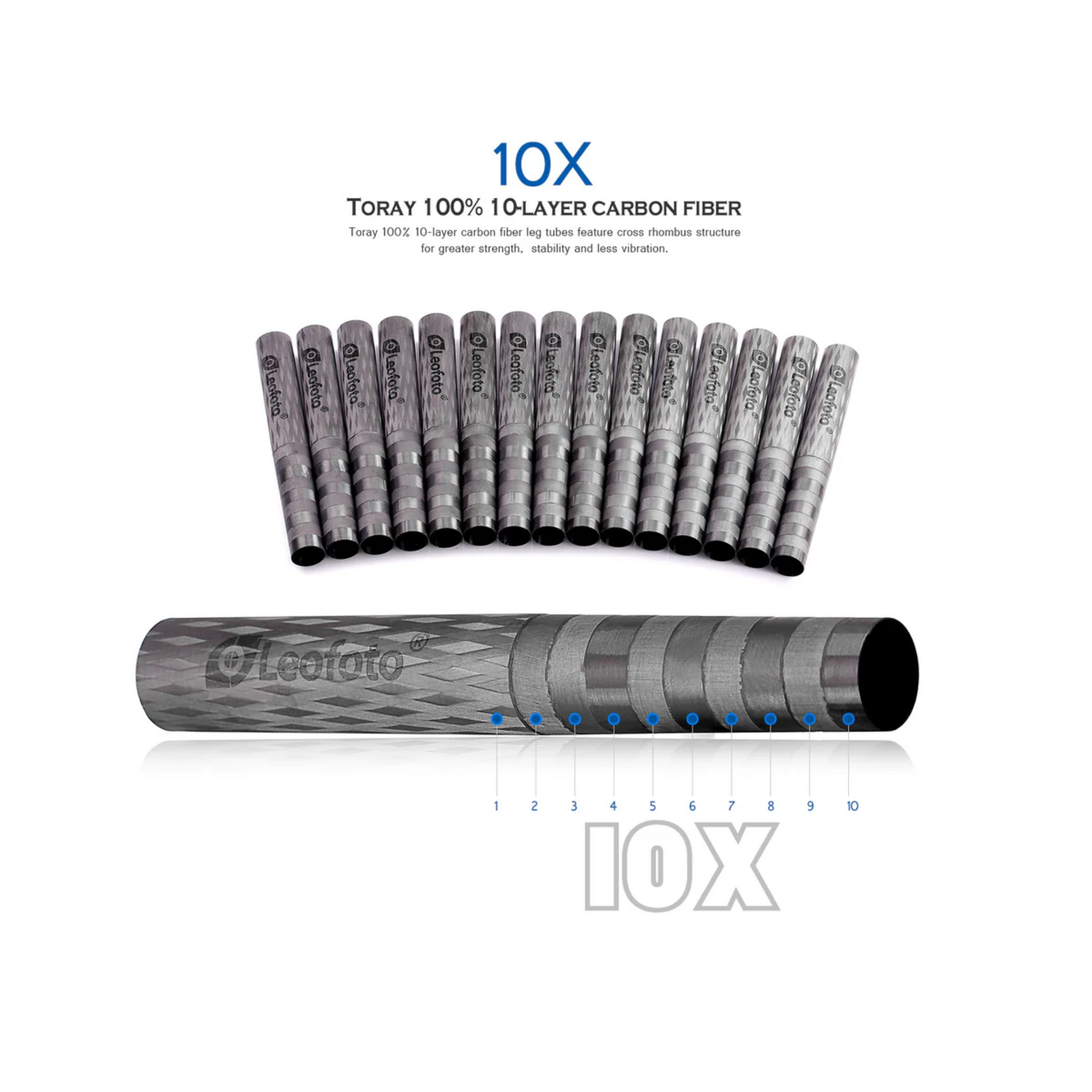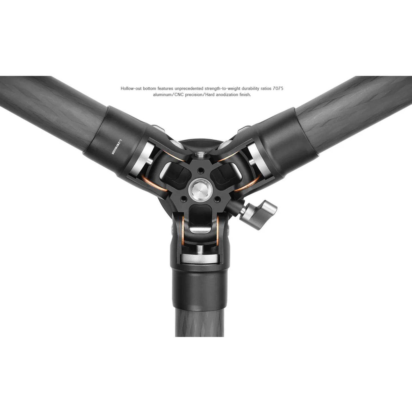 Leofoto tripods feature 10x carbon fiber tubes that make the tripod lightweight while maintaining a strong load capacity. The 6061 aluminum parts are CNC machined and hard anodized, making the surface tough against scratching and scuffing. The twist leg lock system is quickly deployed with a simple quarter turn. With the tripod's three variable leg angles, it allows you to splay the legs completely out, so the support can drop to a very low minimum height.