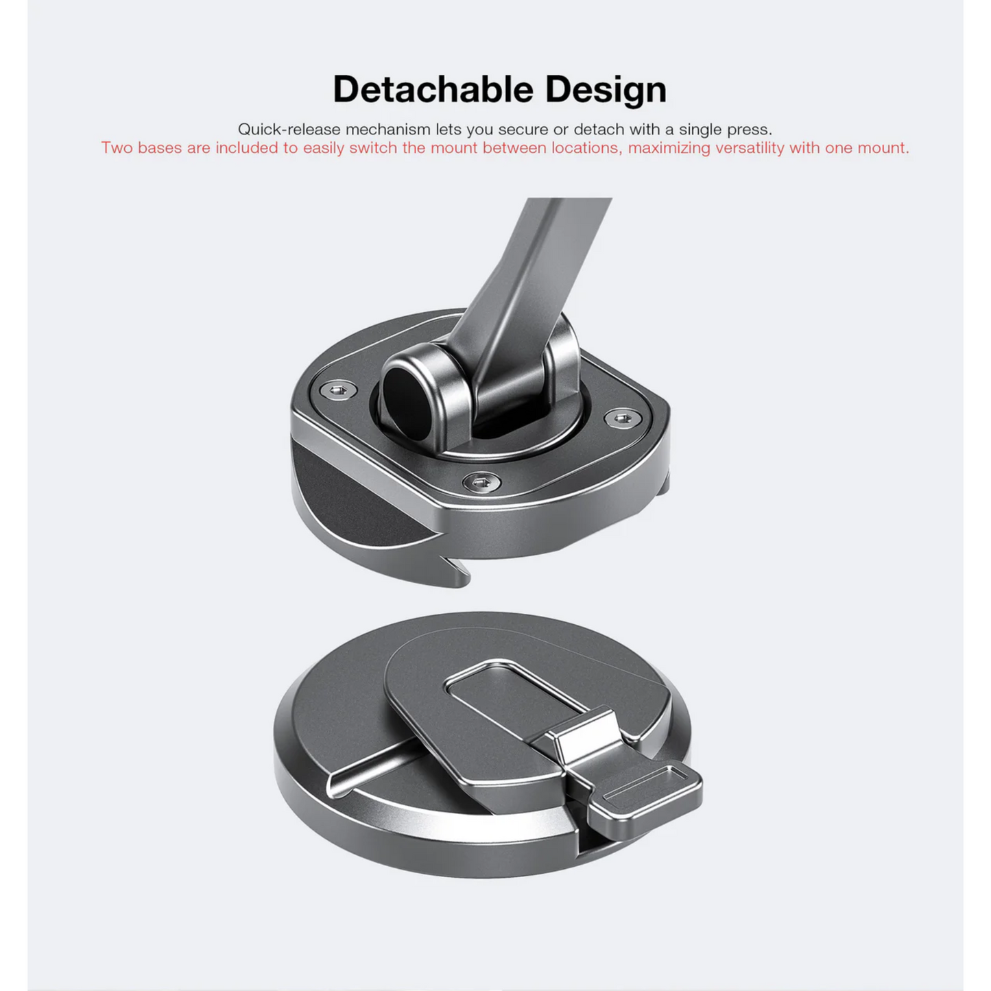 - Dual Base Design: Includes two bases – a quick-release adhesive base for dashboard mounting and an Arca-Swiss compatible base for camera tripods, providing versatile use across setups.