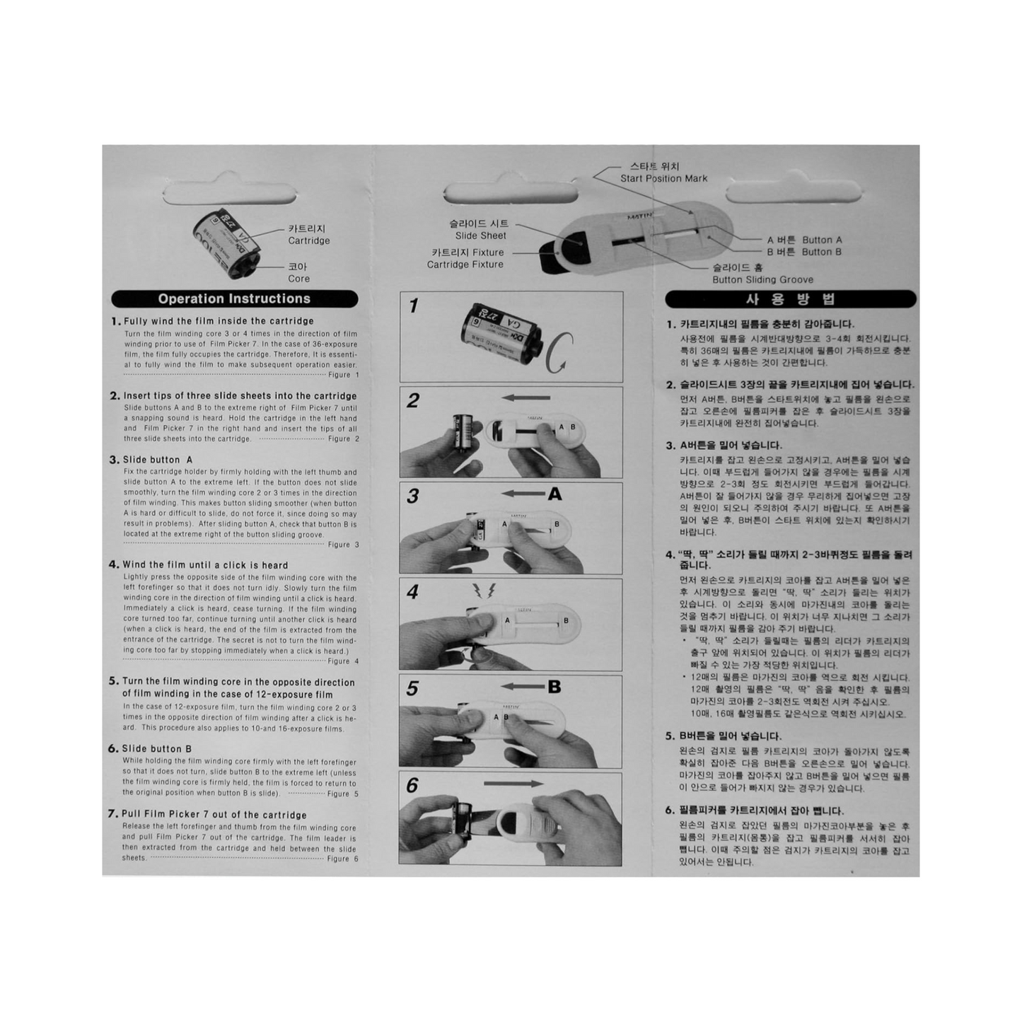 7) Slide B all the way upwards into the canister while doing step 6 so it doesn't push the film lead back into the canister.