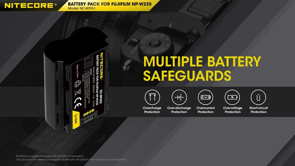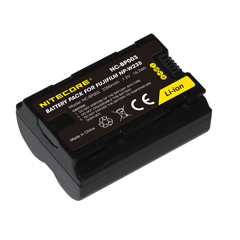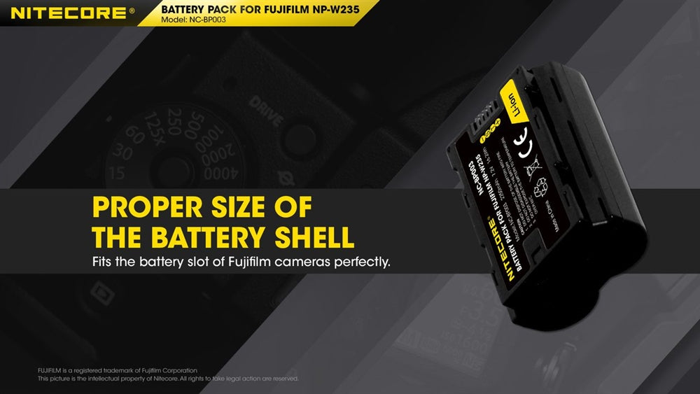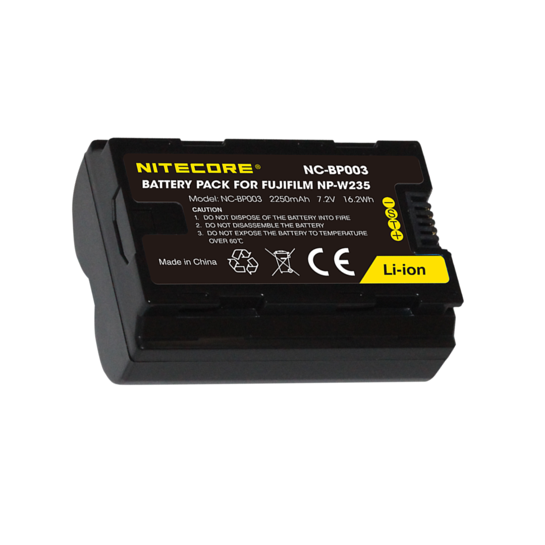 The Nitecore NC-BP003 is a drop-in replacement for the Fujifilm NP-W235 battery to take your filming to the next level. The NC-BP003 is compatible with Fujifilm's prosumer grade mirrorless cameras, the X-T4 and GFX100S. Never miss the perfect moment and take up to 500 photos on a full charge, with the high capacity 2250mAh rating.