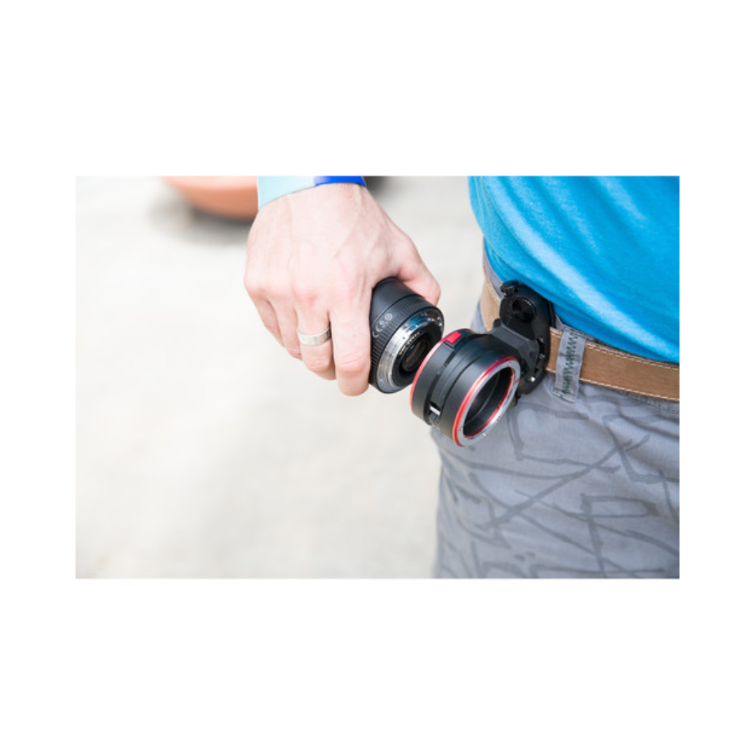 For those occasions when you're carrying more than one lens, the Canon EF CaptureLENS from Peak Design will help you change lenses faster, and with added versatility. Simply attach the included clip and lens kit adapter to a backpack, strap, bag, or belt. With the CaptureLENS you can change lenses with one hand, while at the same time, have a convenient place to store the lens you just removed. An added benefit is that by storing the lens outside of your camera bag; space will be freed up for other gear.