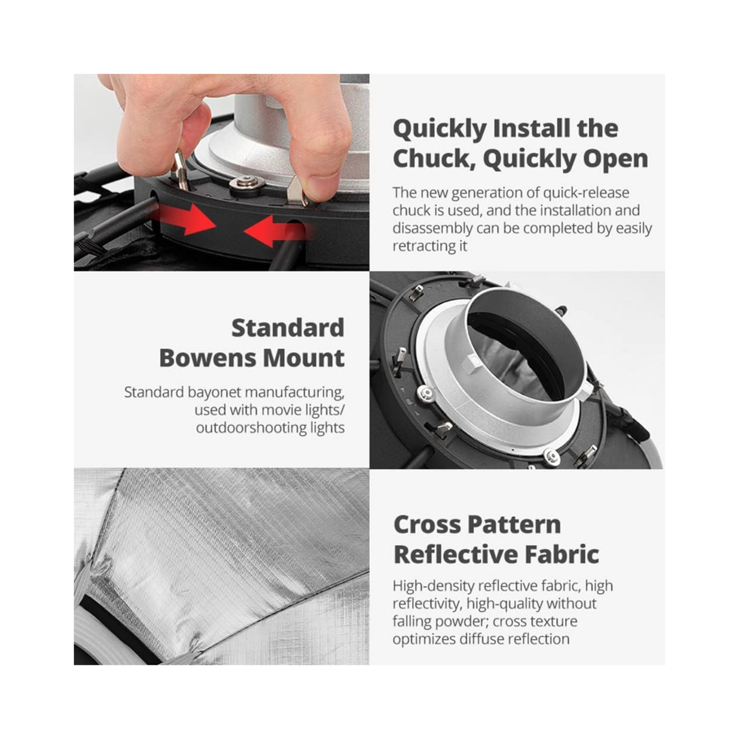 - Inside with Reflect Silver and front light diffuser, ideal for Speedlite, Monolight, Strobe or Eslave.