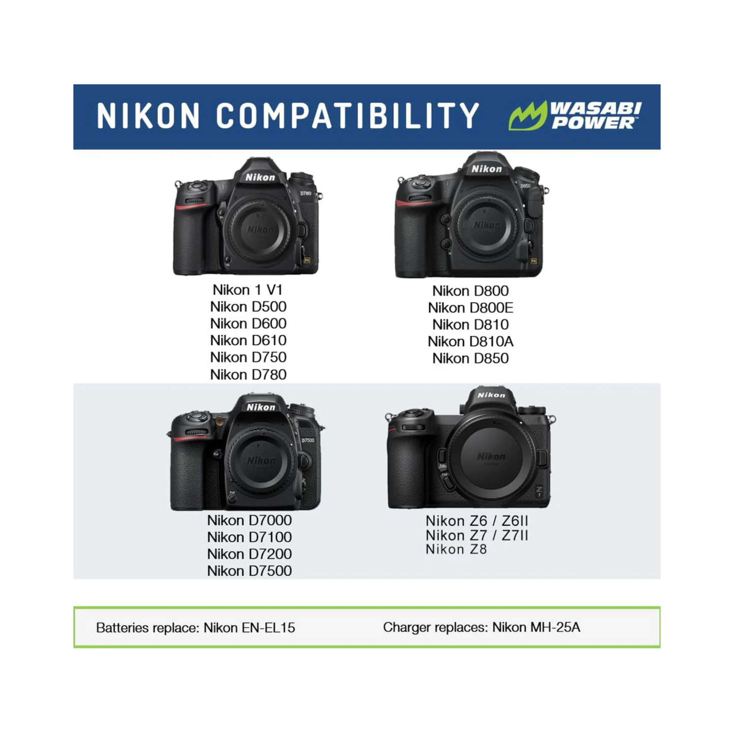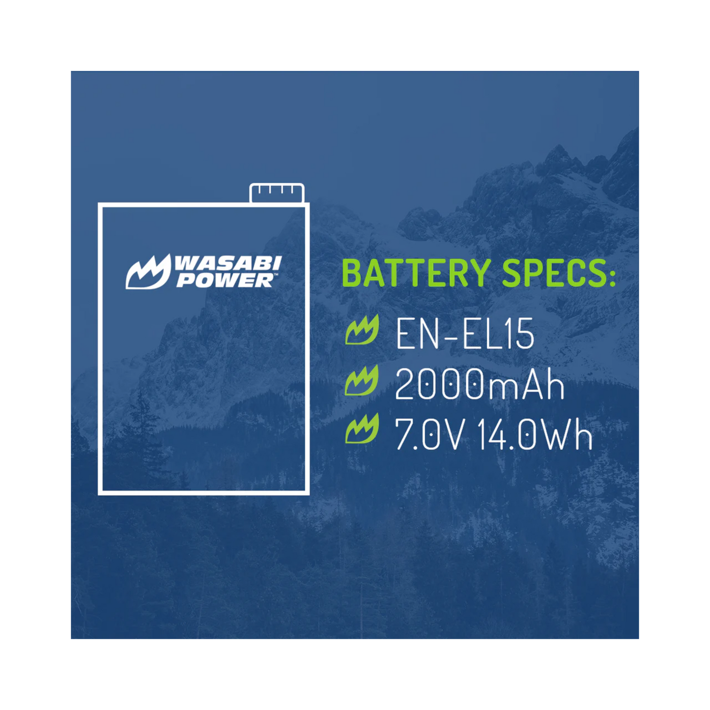 The Wasabi Power ENEL15 battery replaces the Nikon EN-EL15 battery pack. This battery features 2000mAh which provides a longer run-time between charges. It is made with premium grade-a cells to provide maximum battery life and also comes with a 3-year manufacturer warranty. Additionally, the Wasabi Power ENEL15 is completely compatible with all Nikon original equipment including the charger and camera. Batteries replace Nikon EN-EL15, EN-EL15a, EN-EL15b, EN-EL15c. Need a Nikon D850 battery? Buy a Wasabi Power Nikon battery for D850.